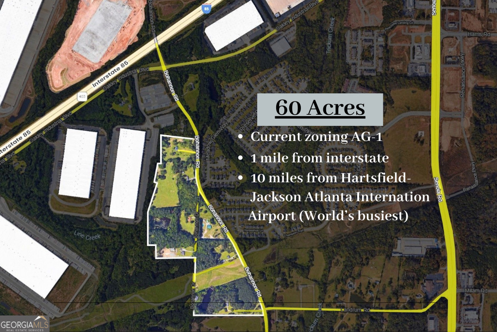 **Investment Opportunity!** Welcome to South Fulton County, Georgia, USA. This property comprises a 60-acre assemblage currently zoned AG1, with potential for commercial and mixed-use zoning. It is conveniently located just 1 mile from Interstate 85 (Tyrone/Fairburn Exit 61), 10 miles from Hartsfield-Jackson International Airport (the world's busiest), and 6 miles from Trilith Studios, the second-largest movie production studio in the country. The property features three access points, and all utilities are available, including sewer access in some areas. If you need road frontage, this property has 4,896 feet of frontage along two roads. **Complete Assemblage:** 9301 Bohannon Road; 8125 Bohannon Drive; 8145 Bohannon Road ; 8145 Bohannon Road ; 8155 Bohannon Drive Rear Lot ; 8155 Bohannon Drive ; 8156 Bohannon Drive ; 8355 Bohannon Road; 8365 Bohannon Road; 8385 Bohannon Drive Youtube video: https://youtu.be/BCuxLdvfsP4 Do not walk the property without an appointment, as the homes are occupied. Also, be aware of dogs on the premises.